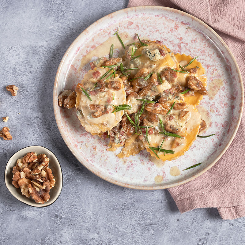 Die Pasta auf 2 Teller verteilen und mit frischem Rosmarin garnieren.